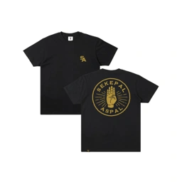 The Goldstack T‑Shirt is Sekepal Aspal’s way of turning a simple black tee into a statement. Made from solid cotton that feels good from the first wear, it’s built to last through rides, gigs and late nights. On the front, the design keeps it low‑key with a sharp “SA” mark sitting on the chest like a badge. The back flips the energy: a raised hand surrounded by radiant lines, printed in bold gold that jumps off the fabric. It’s not just decoration, it’s a signal, a reminder, a mark of the crew. With durable plastisol ink and reinforced details, this shirt is made to stay in rotation. The Goldstack isn’t just clothing; it’s a piece of the asphalt story you carry with you every time you throw it on.